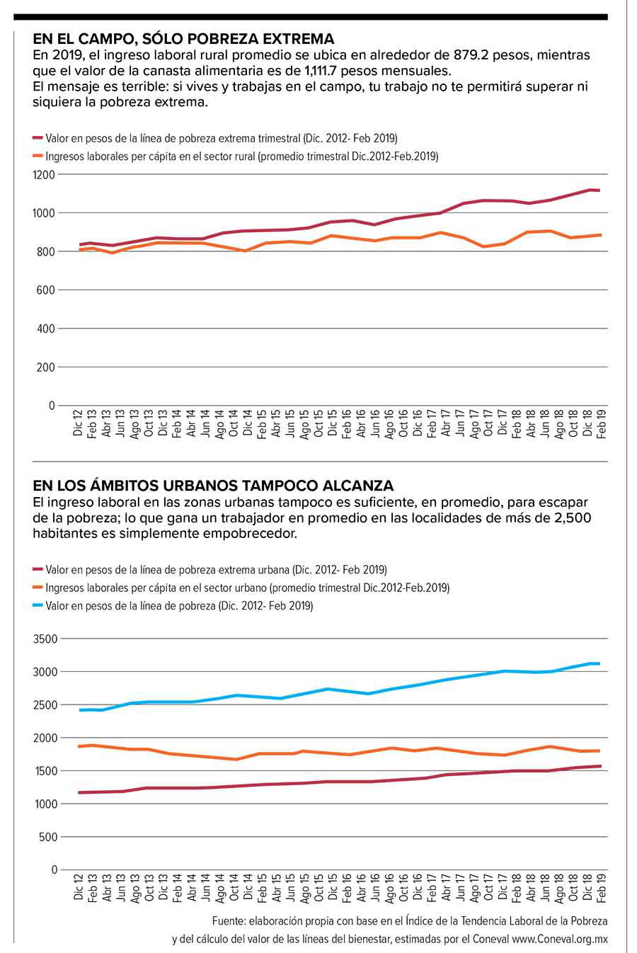 De acuerdo con el Coneval, en la administración 2012-2018 el valor de la línea de la pobreza extrema tuvo un crecimiento de prácticamente 26% en el ámbito rural, y de 26.4% en los ámbitos urbanos. Por su parte, el valor de la línea de la pobreza tuvo, para el mismo periodo, un incremento del 24.1% en el sector rural, mientras que en los ámbitos urbanos mostró un crecimiento de 23.1 por ciento. En contraste, el valor real del ingreso laboral per cápita en el ámbito rural tuvo un incremento, en el mismo periodo, de apenas 8.5%, y de 3% para los ámbitos urbanos.