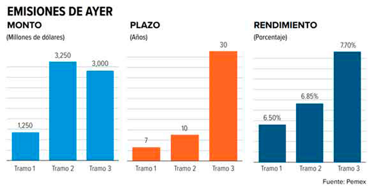 En un comunicado, la empresa explicó que la operación se dividió en tres bonos, el primero de ellos por un monto de mil 250 millones de dólares, con vigencia de siete años y un rendimiento de 6.50%, del segundo fue por 3 mil 250 millones de dólares a 10 años con una tasa de 6.85% y el último de 30 años por 3 mil millones de dólares y 7.70 por ciento.