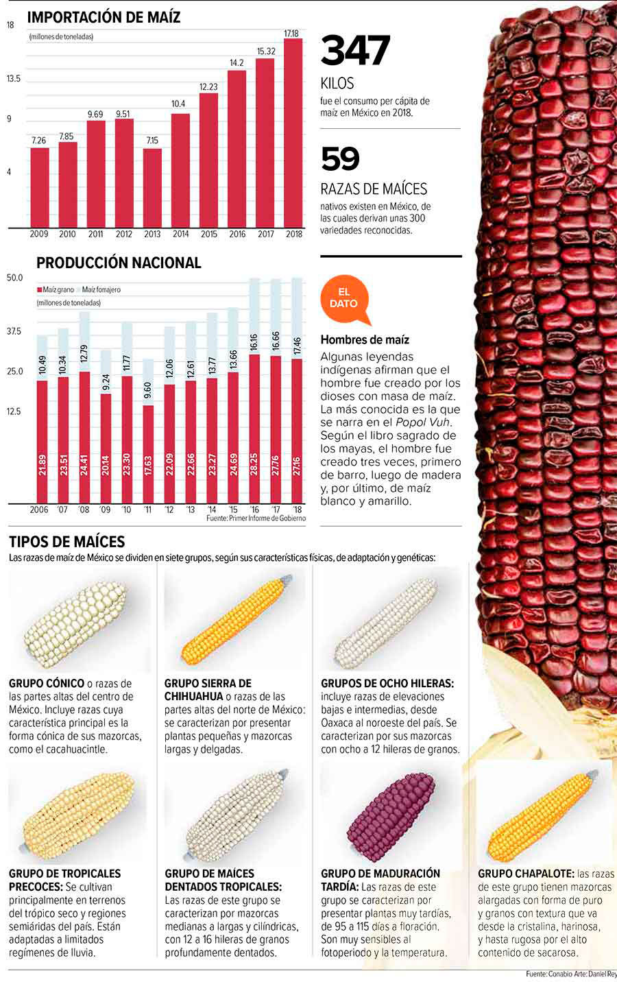 Según cifras del Primer Informe de Gobierno de la actual administración, la importación de maíz ha aumentado en 136.7%, al pasar de 7.3 millones de toneladas en 2009 a 17.2 millones de toneladas en 2018, pese a que la producción de este grano en México se ha mantenido estable en los últimos 10 años, con un promedio de 23.6 millones de toneladas al año.
