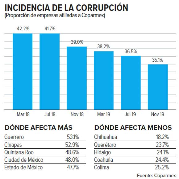 En cuanto a actos de corrupción, se detalló que 35% de los agremiados experimentó algún acto de corrupción, menor que en el pasado.
