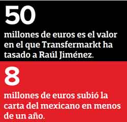 22 goles y 10 asistencias en la presente temporada tienen a Raúl Jiménez en su mejor año deportivo y esto se ha visto reflejado en los 50 millones de euros en los que el portal Transfermarkt los ha tasado en su última actualización.
