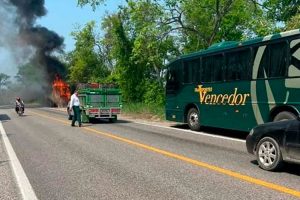 San Luis Potosí.- Este sábado la Guardia Nacional división Caminos, con apoyo de Bomberos Ciudad Valles, Cruz Roja y voluntarios atendieron incendio de autobús en la carretera México Laredo, a un kilómetro del Coy,.