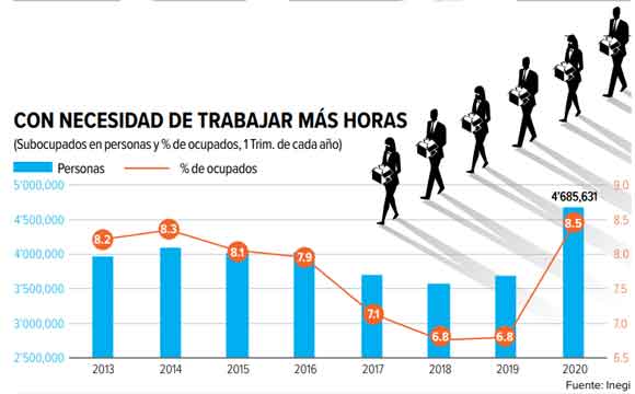 La población subocupada, entendida como aquella con necesidad de trabajar más tiempo, sumó 4 millones 685 mil personas en el primer trimestre de 2020, lo que representó 8.5% de las personas ocupadas, tasa superior a la registrada en el igual periodo de 2019, cuando se ubicó en 6.8%, equivalente a sumaron 3 millones 683 mil.