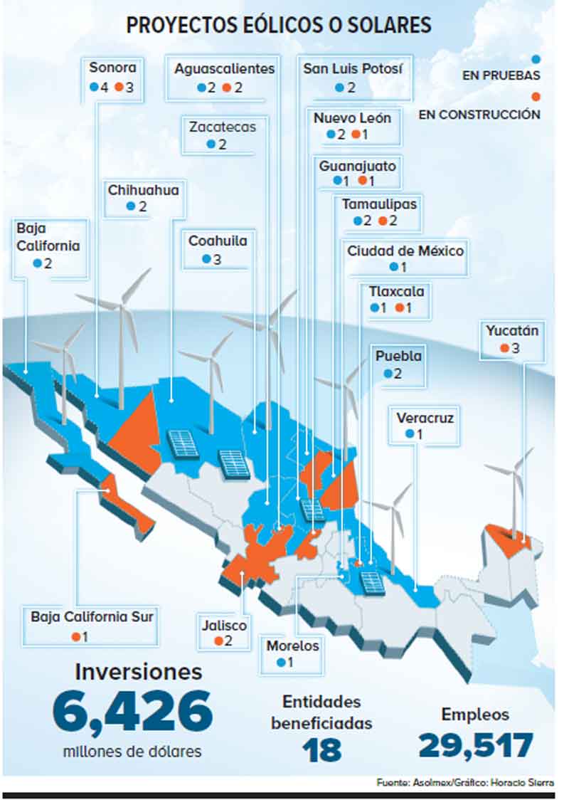 Ciudad de México.- Trece proyectos eólicos y solares afectados por la reciente política sobre su participación en el sistema eléctrico podrán retomar las pruebas preoperativas, luego de que un juez especializado les otorgara suspensiones definitivas contra un acuerdo emitido por el Centro Nacional de Control de Energía (Cenace).