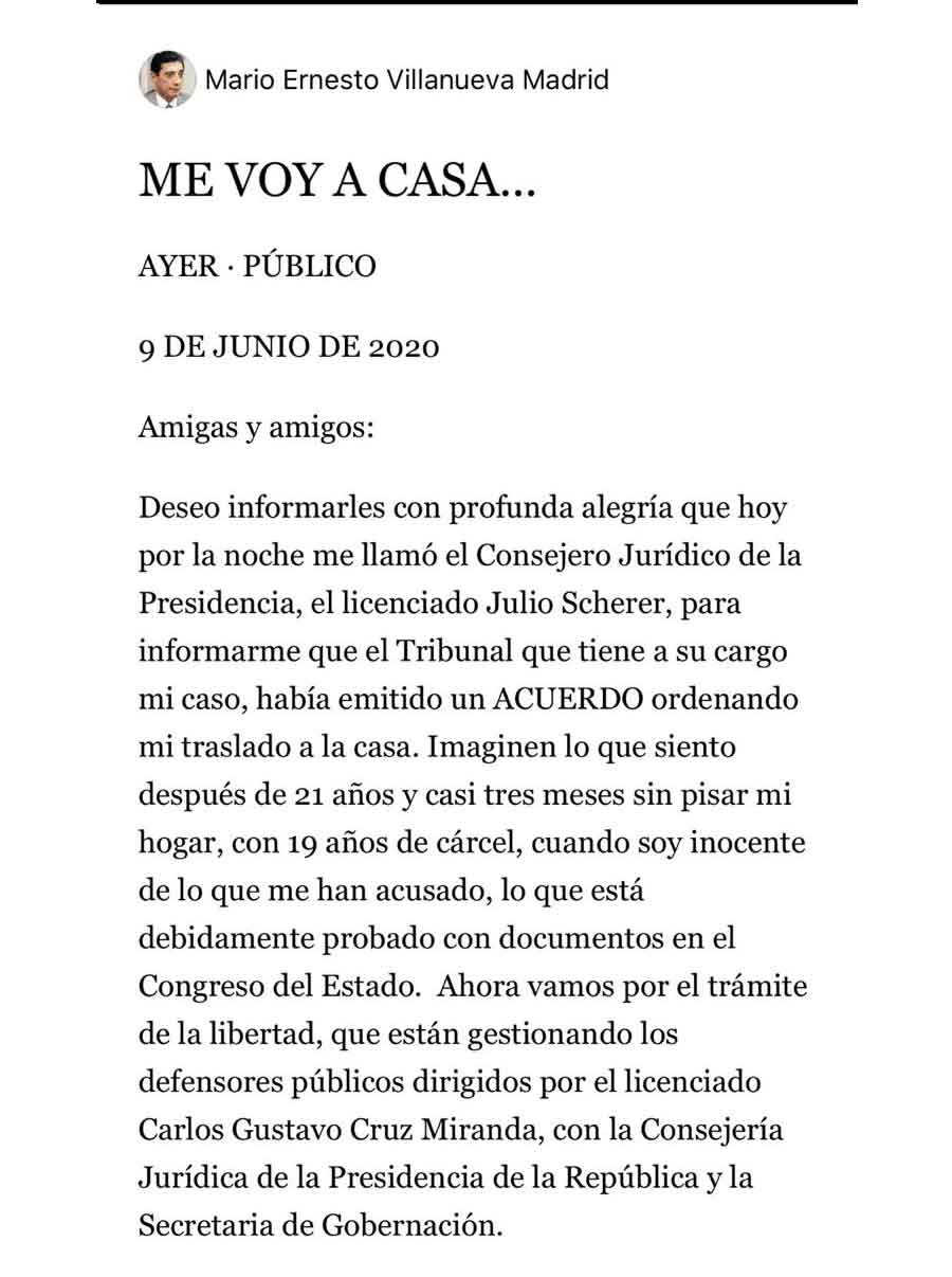 Vaillanueva Madrid publicó en sus redes sociales que le llamó el Consejero Jurídico de la Presidencia, el licenciado Julio Scherer, para informarle que el Tribunal que tiene a su cargo su caso, había emitido un acuerdo ordenando su traslado a casa.