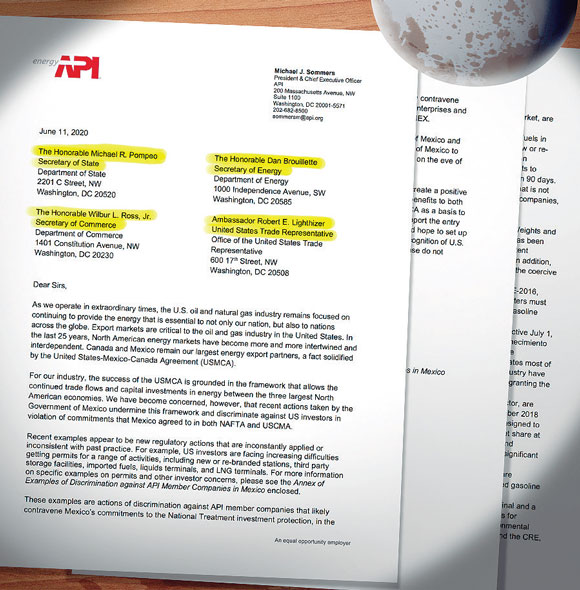 Michael Sommers, director general del organismo, que representa a más de 600 miembros que producen, procesan y distribuyen energía a internacional, envió una carta a las autoridades de EU, entre los que destaca Michael R. Pompeo, secretario del Departamento de Estado; Dan Brouillette, titular del Departamento de Energía; y Wilbur L. Ross, del Departamento de Comercio, entre otros, a quienes piden intervengan para que sus agremiados tengan trato justo.