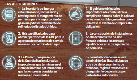 Dijo que los inversores estadunidenses se están enfrentando a dificultades cada vez mayores para obtener permisos que van desde la operación de estaciones de servicio, nuevas o ya existentes, así como la construcción de instalaciones de almacenamiento, para la importación de combustibles, terminales de líquidos y terminales de Gas Natural Licuado, entre otros.