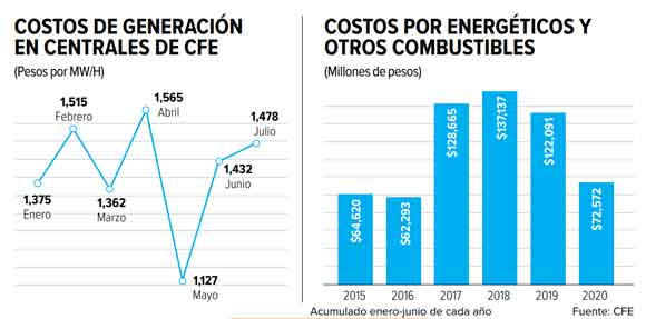 Según los datos contenidos en las Memorias de cálculo de tarifas de suministro básico 2020, en junio el costo volvió a elevarse a mil 432 pesos por megawatt hora, mientras que en julio ya alcanzó los mil 478 pesos por megawatt hora, por lo que aún no se alcanza el costo abril, el cuál fue el más alto en lo que va de este 2020.