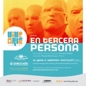 El domingo 23 de agosto a las 13:00 horas, la compañía dancística Physical Momentum (México), presenta “En Tercera Persona”, una propuesta escénica que exterioriza las variables filosóficas de nuestra identidad. Hablar de uno mismo a través de la mirada del otro. La otredad como demonización y deshumanización de quienes somos como individuos. “El infierno es la mirada del otro, pues esos “otros” somos nosotros mismos” –Sartre. Intérpretes: Francisco Córdova, Alfonso López, Luis Vallejo y Carlos Zamora.