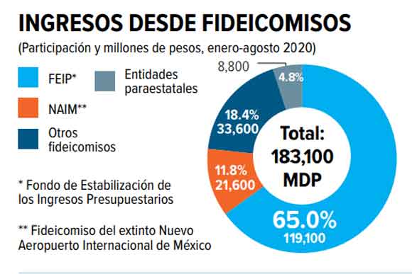 A agosto, el gobierno ya echó mano de 119.1 mil millones de pesos del Fondo de Estabilización de los Ingresos Presupuestarios (FEIP), 21.6 mil millones de pesos del Fideicomiso del Nuevo Aeropuerto Internacional de México y 33.6 mil millones de pesos de otros fideicomisos. Además, de 8.8 mil millones de pesos de algunas entidades paraestatales, para un total de 183.1 mil mdp.