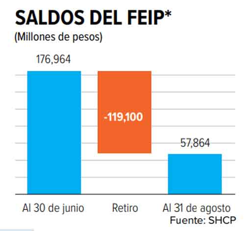 Mientras que el FEIP se quedaría con un saldo 57 mil 864 millones de pesos para compensar las caídas presupuestarias en los siguientes meses y para el próximo año.
