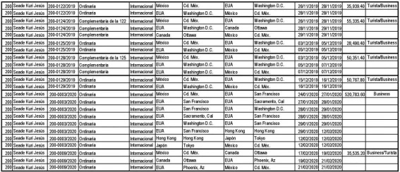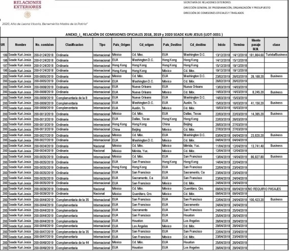 Entre 2018 y 2020 el funcionario viajó cinco ocasiones a la ciudad asiática. En todos los casos cargó al erario federal el costo de los vuelos en clase premier, así como los viáticos, con la justificación de que se trataba de comisiones autorizadas por la Secretaría de Relaciones Exteriores.