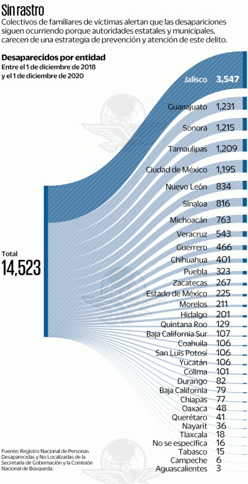 Los estados donde hay una mayor cantidad de desapariciones son Jalisco, con 3 mil 547 casos; Guanajuato, mil 231; Sonora, mil 215; Tamaulipas, mil 209; Ciudad de México, mil 195; Nuevo León, 834; Sinaloa, 816; Michoacán, 763; Guerrero, 466, y Chihuahua, 401.