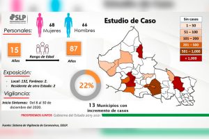 Lutzow Steiner agregó que los 134 nuevos casos están en el rango de 15 a 87 años de edad y se consideran 132 casos de transmisión local y dos foráneos. Los 16 lamentables decesos son 6 hombres y 10 mujeres, con residencia en la capital (7), Cerritos (3), Soledad, Catorce, Ciudad Valles, Ébano, Huehuetlán y Tanquián de Escobedo. Los decesos tenían factores concomitantes de riesgo como edad (12), hipertensión (9) obesidad (4), diabetes (6).