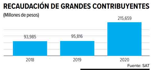 De este total, 44 por ciento fue obtenido por fiscalización a los grandes contribuyentes, quienes aportaron a las arcas del gobierno 215 mil 659 millones de pesos.
