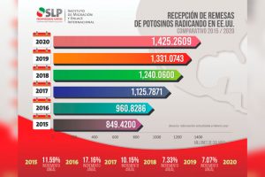 El total recibido en 2020 en San Luis Potosí son 1 mil 425 millones de dólares y los municipios con mayor captación de remesas fueron la capital del estado, seguido de Rioverde, Matehuala, Salinas, Soledad de Graciano Sánchez, Ciudad Valles, Cerritos, Tamazunchale, Santa María del Río y Villa de Ramos.