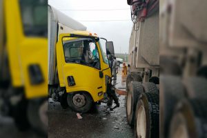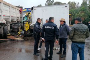 La falta de precaución al conducir y el piso mojado ocasionaron que un camión cargado con azúcar se impactara contra un tráiler quinta rueda que venía vacío.