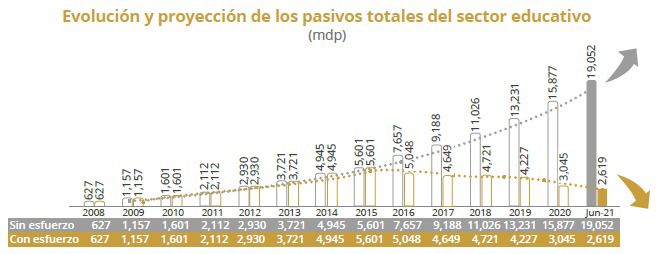 En estos, destacan los relacionados al sector educativo que se habían incrementado de 627 mdp a 5 mil 601 mdp en el periodo 2008 – 2015, y para cuya atención se implementaron una serie de medidas estructurales y aportaciones financieras extraordinarias que permitieron revertir la tendencia que de otra forma hubiera llevado a acumular adeudos por más de 19 mil millones de pesos en lugar de los 2 mil 619 registrados al segundo trimestre de 2021