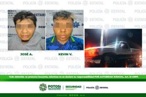 Por último, camino a Portezuelo en el municipio de Cerro de San Pedro, Policías Estatales del Grupo de Operaciones Tácticas detuvieron a José A., de 22 años de edad y a Kevin V., de 21 años de edad a quienes se les aseguró una camioneta marca Chevrolet, tipo Pick Up, color blanco, modelo 2001, de procedencia extranjera, la cual fue robada el 18 de diciembre de 2021 en la colonia Ricardo B. Anaya.
