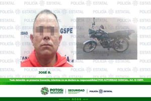 Continuando con los dispositivos en la calle Isabel Robles, en la colonia Mártires de la Revolución, los Estatales detuvieron a José R., de 43 años de edad a quien se le aseguró una motocicleta marca Italika, modelo 2018, color azul, con placa de esta entidad.