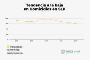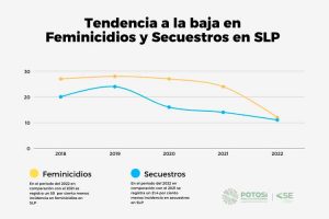 San Luis Potosí,- Durante el año 2022, de acuerdo con el informe del Secretariado Ejecutivo del Sistema Nacional de Seguridad Pública (SESNSP), el Estado de San Luis Potosí obtuvo una disminución del 50 por ciento en feminicidios; 21.4 por ciento en secuestros; 13 por ciento en robo de motocicletas; así como un 11 por ciento en homicidios dolosos y culposos.