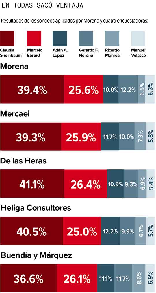 La exjefa de Gobierno ganó en los cinco sondeos aplicados por Morena y cuatro casas encuestadoras. Su ventaja sobre Marcelo Ebrard, el segundo lugar en las preferencias, fue de 13.6%, en promedio.