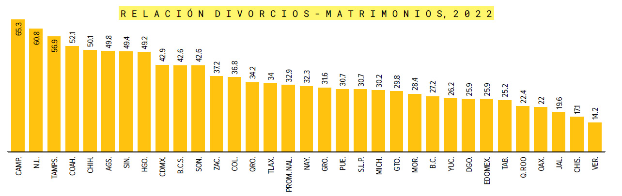 En el año 2022, frente al promedio nacional ya señalado para la relación divorcios- matrimonios, Campeche registró una estadística de 65.3; Nuevo León, de 60.8; Tamaulipas, de 56.9; Coahuila, de 52.1 y Chihuahua, de 50.1; en contraste, las tasas más bajas son de Veracruz, con 14.2; Chiapas, con 17.1 y Jalisco con 19.6 divorcios por cada 100 matrimonios.