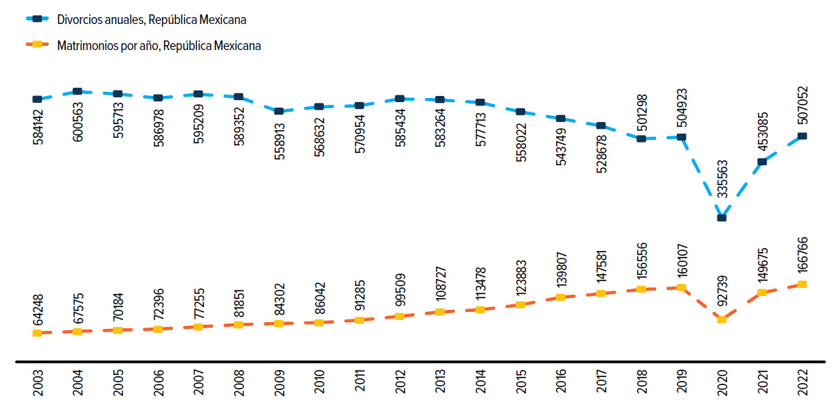De acuerdo con el Inegi, los datos absolutos implican un acelerado crecimiento de la relación divorcios-matrimonios: en el año 2003 la relación fue de 11 divorcios por cada 100 matrimonios; para el año 2010 la relación creció a 15.1; para el 2015 llegó a 22.2 divorcios por cada 100 matrimonios; en 2020, a pesar de la disminución en magnitud de ambos casos, la relación se ubicó en 27.6, pero en 2019 había sido de 31.7. Para el año creció una vez más a 33 divorcios por cada 100 matrimonios, mientras que en 2022 la cifra es de 32.9.