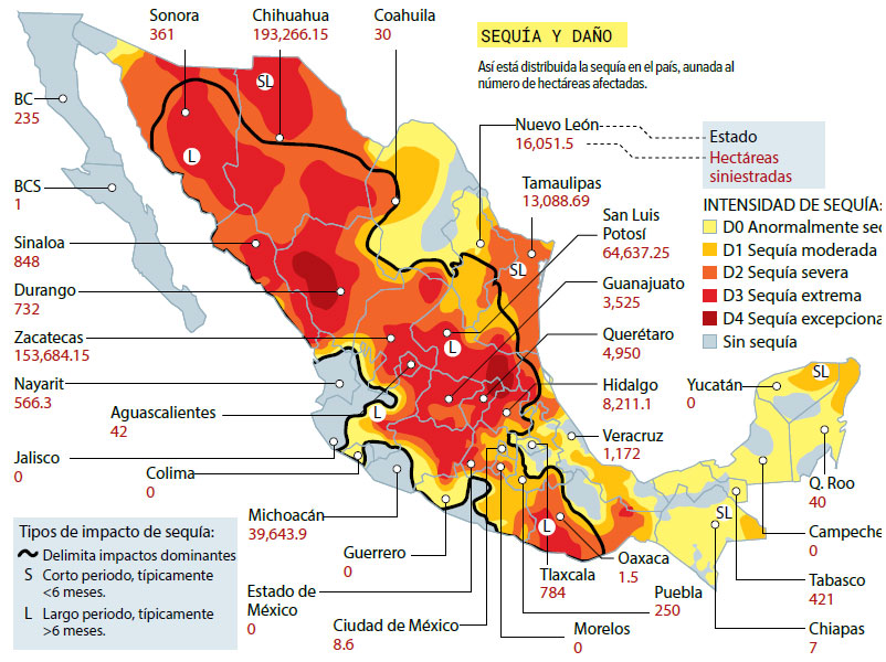Le siguen Zacatecas, con 153 mil 684 hectáreas estropeadas y 86.6% de su territorio en sequía severa y extrema; San Luis Potosí, con 64 mil 637 hectáreas afectadas, 60% de su superficie en sequía extrema y 12.6% en excepcional (el nivel más alto); Michoacán, con 39 mil 643 hectáreas dañadas y 55% de área con sequía severa y extrema; Nuevo León, con 16 mil 51 hectáreas siniestradas y 65.8% de la entidad con sequía moderada y severa, y Tamaulipas, con 13 mil 88 hectáreas impactadas y 97.7% de su superficie en sequía moderada, severa y extrema.